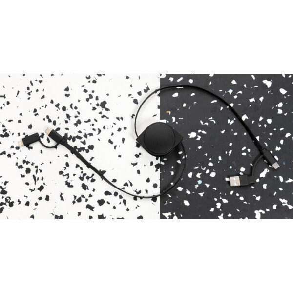 6-in-1 intrekbare kabel waarbij de behuizing is gemaakt van RCS-gecertificeerd gerecycled ABS-plastic en de draad van gerecycled TPE. RCS (Recycled Cl…