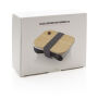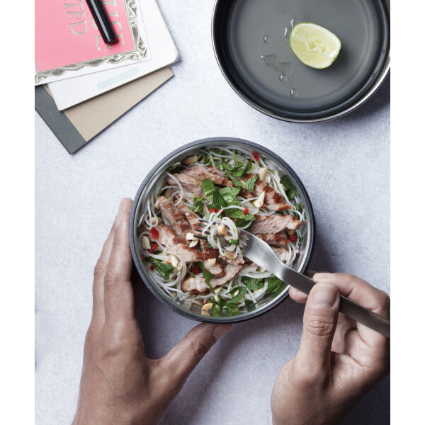 Het siliconen deksel voorkomt spatten tijdens het opwarmen in de magnetron. en de basiscontainer is gemaakt van duurzaam polypropyleen gecombineerd met duurzaam geproduceerde houtvezels die de glazen kom beschermen om hem gemakkelijk vast te houden na het magnetronen. Het roestvrijstalen deksel wordt op de basis geschroefd en zorgt voor een lekvrije afdichting.