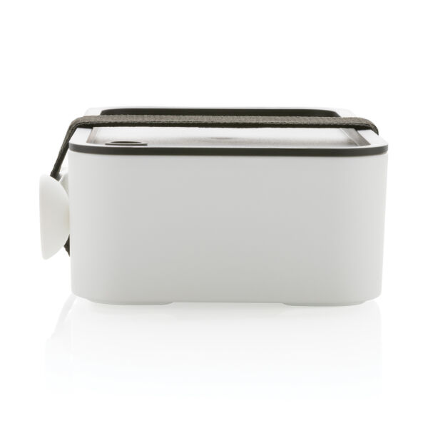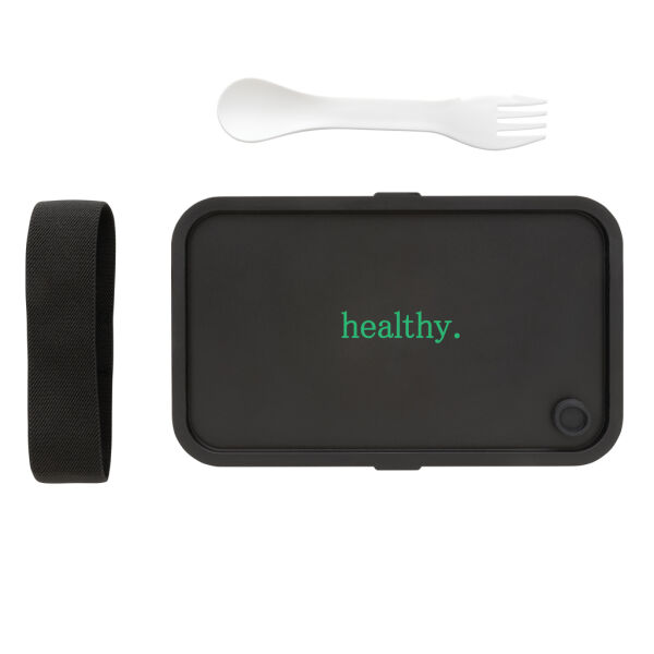 Deze stijlvolle en stevige lunchbox past perfect bij een healthy lifestyle! Hij is groot genoeg om sandwiches en heerlijke salades mee te nemen. Gemaakt met 93% GRS-gecertificeerd gerecycled PP, GRS-certificering zorgt voor een volledig gecertificeerde toeleveringsketen van de gerecyclede materialen. Inclusief handige spork en elastische band. Inhoud 0,8 liter. De lunchbox is makkelijk schoon te maken, maar mag niet in de vaatwasser worden geplaatst of in de magnetron worden gebruikt.