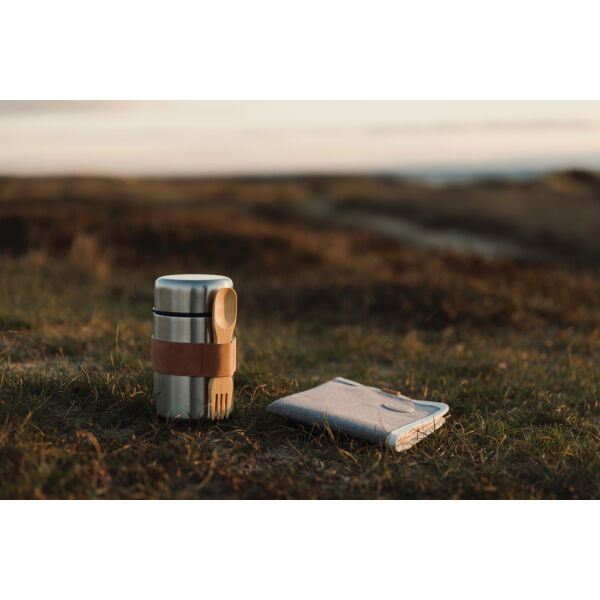 Hoge kwaliteit voedsel thermoscontainer in 18/8 staal. De bijbehorende houten lepel kan worden opgeborgen in een riem die aan de thermoscontainer is bevestigd. De grote opening maakt het gemakkelijk om te vullen, schoon te maken en direct uit de thermoscontainer te eten.