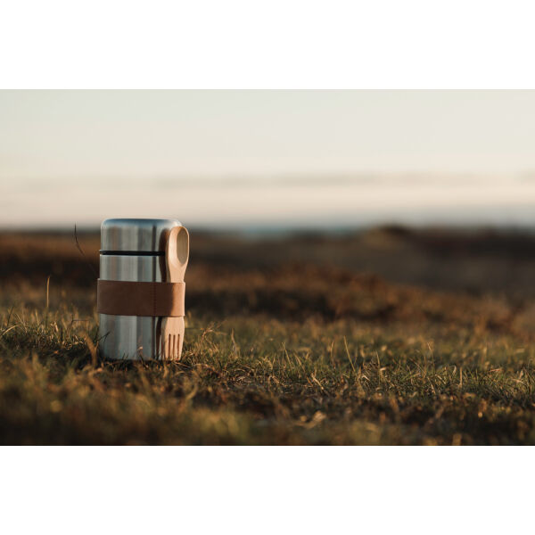 Hoge kwaliteit voedsel thermoscontainer in 18/8 staal. De bijbehorende houten lepel kan worden opgeborgen in een riem die aan de thermoscontainer is b…