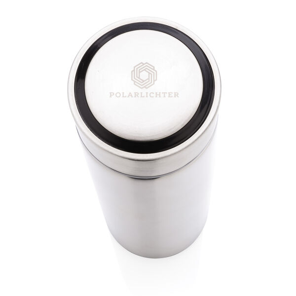 Houd koffie of thee lekker warm met deze roestvrijstalen vacuümfles met geborsteld metalen dop. De fles heeft een lekvrij schroefdop en maakt drinken van elke kant mogelijk. De brede opening maakt eenvoudige reiniging mogelijk. Capaciteit 450 ml. BPA-vrij.