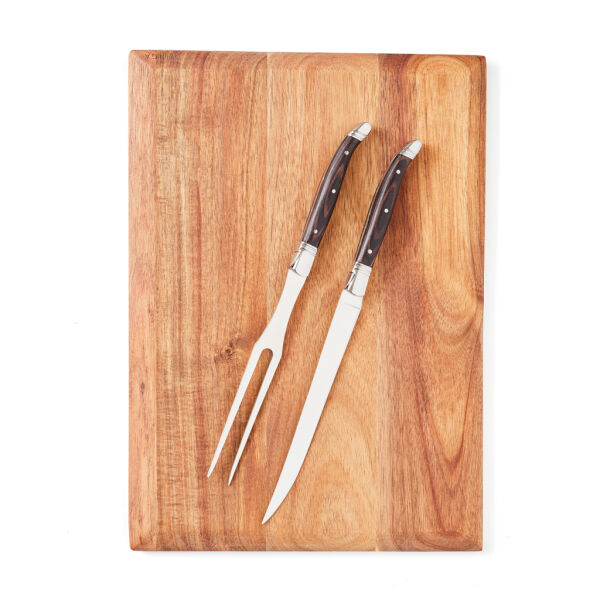 Een trancheerset in typisch Frans geïnspireerde bistro-stijl. Gemaakt van roestvrijstaal. De handvaten van het koksmes en de vleesvork zijn gemaakt van zwart pakkahout . Wordt geleverd in een luxe geschenkverpakking.