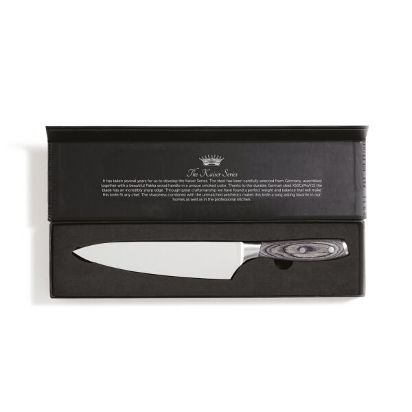 Dit koksmes (20 cm lemmet) is vervaardigd van Duits X50CrMoV15 staal en het handvat is gemaakt van pakkahout. De goede vormgeving van het gehele mes zorgt ervoor dat het prettig aanvoelt en eenvoudig is in gebruik.