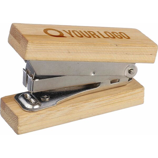 Kleine bamboe nietmachine. Inclusief 50 nietjes. Nietmaat: nr. 10. Per stuk verpakt in een bruin kartonnen geschenkdoos.