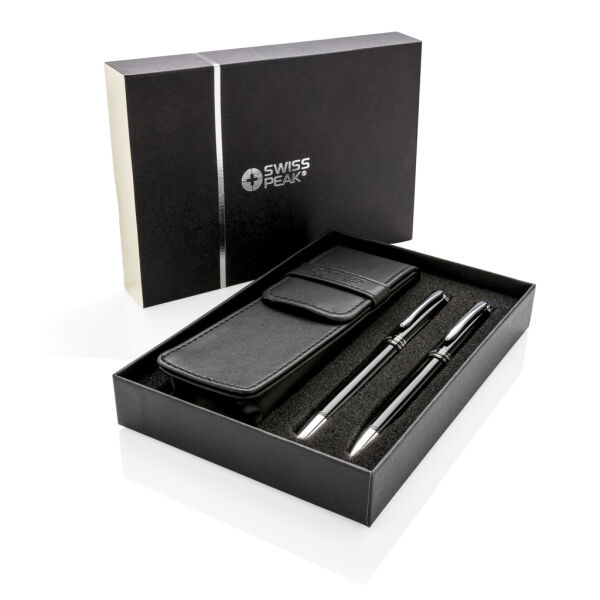 Authentieke pennenset met alle kenmerken van klassieke kwaliteit. Kwalitatief hoogwaardige zware messing metalen rollerball met stylus en balpen met Swiss Peak branding. Inclusief premium PU lederen etui en giftbox. Blauwe vulling.