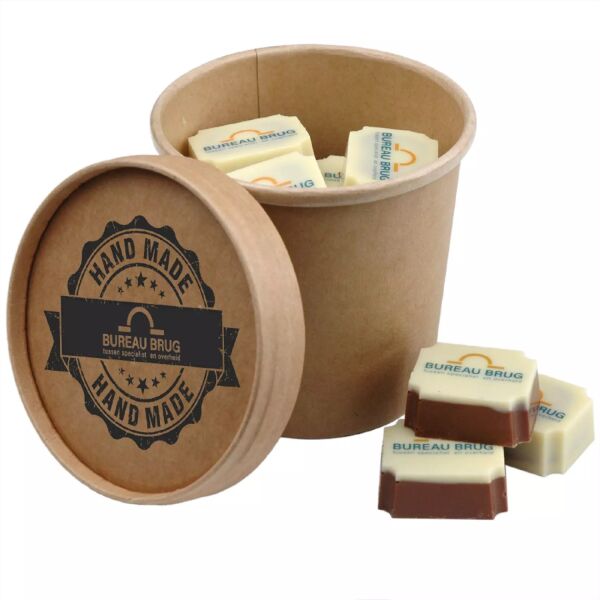 Een bonbon gemaakt van de allerbeste couverture van Barry Callebaut. De vulling is 'standaard' een hazelnootpraliné maar andere vullingen zijn op aanvraag mogelijk. De logobonbons leveren wij in de smaken melk, puur en wit. Ze hebben een witte toplaag voor de full colour bedrukking. Elke bedrukking is mogelijk, logo's, teksten, foto's, QR-codes, noem maar op. Al onze chocolade voldoet aan de hoogste kwaliteitseisen. De smaak is subliem en zult u zeker verrassen.