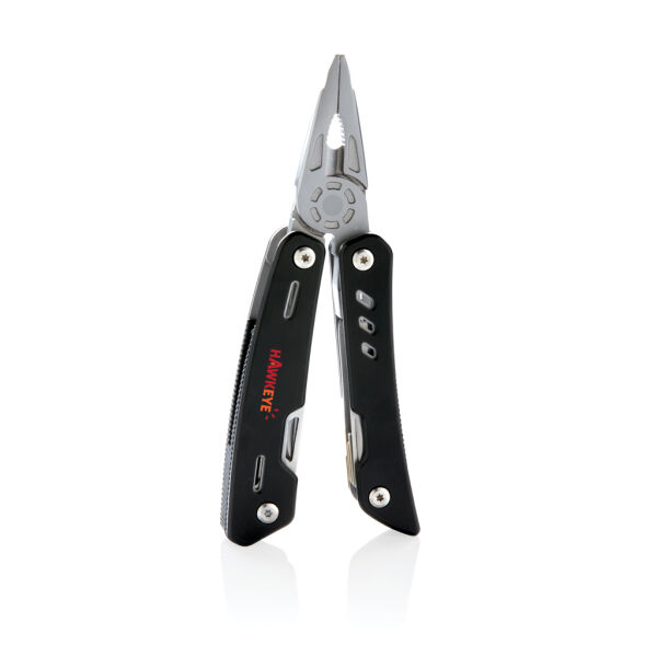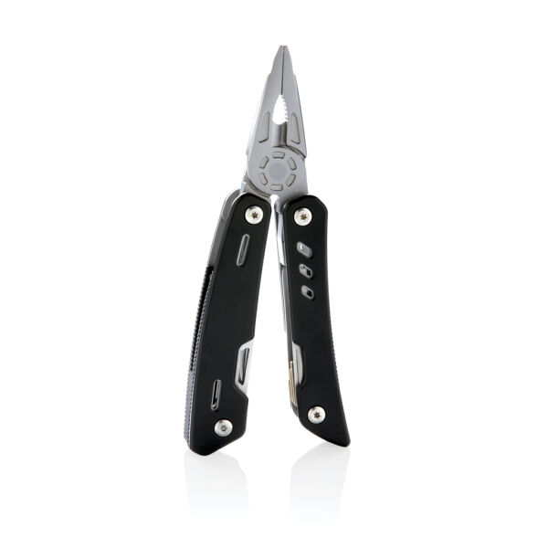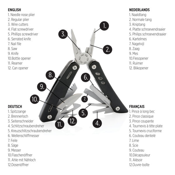 Sterke en duurzame multitool met 12 functies. Met aluminium behuizing en roestvrij stalen gereedschap. Inclusief: naaldbektang, gewone tang, kniptang, mes, kruiskopschroevendraaier, kleine schroevendraaier met platte kop, zaag, blikopener, flesopener, gekarteld mes, priem, vijl & grote schroevendraaier met platte kop. Verpakt in geschenkverpakking.