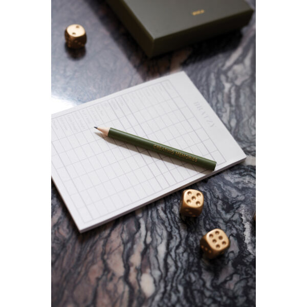 Dit is Yahtzee in een luxe jasje! Met gouden dobbelstenen en een luxe balpen, maken we van het Yahtzee een exclusief spel, namelijk: Bratzy! Dit spel wordt geleverd in een stijlvolle verpakking met een gouden tekst erop, waardoor het chique is om weg te geven maar ook om als decoratie op de salontafel te gebruiken is.