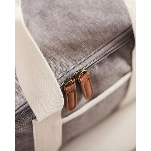 Een ultieme koelmand met gemêleerde kleuren en details gemaakt van katoen en imitatieleer. De koeltas heeft ook een klein compartiment aan de buitenk…