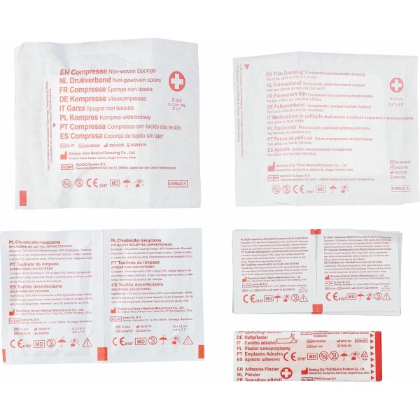 EHBO-tasje van rPET 600D polyester met klittenbandsluiting en draaglus. Voorzien van PVC-vakken en gevuld met 17 onderdelen: 5 pleisters, 1 steriel filmdoekje, 1 non-woven spons, 8 alcoholdoekjes en 2 reinigingsdoekjes. Afgewerkt met een rPET-label aan de buitenkant.